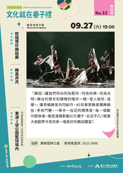 114年台北市政府-社區藝術巡禮-文化在巷子裡,9月27日〈周六〉晚7:00,歐陽慧珍舞蹈團受邀演出-舞風弄月,歡迎各位蒞臨共賞!