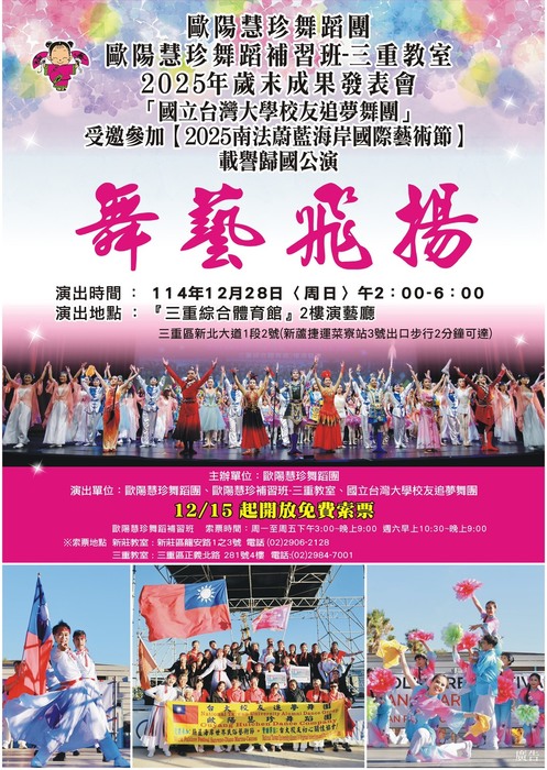 ~歐陽慧珍舞蹈團、歐陽慧珍舞蹈補習班三重教室2025年歲末成果發表會暨國立臺灣大學校友追夢舞團受邀參加「2025南法蔚藍海岸國際藝術節」載譽歸國公演~
