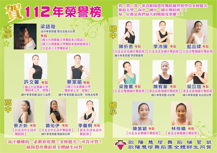 狂賀!歐陽慧珍舞蹈補習班112年升學榮譽榜出爐!升學班成績優異!恭喜優秀傑出的考生們!金榜題名!可喜可賀!